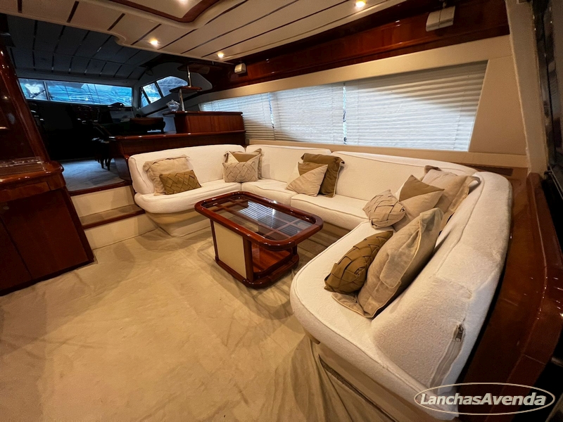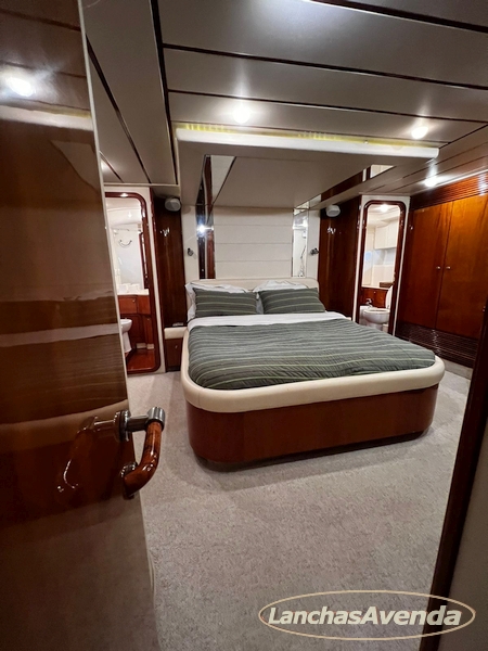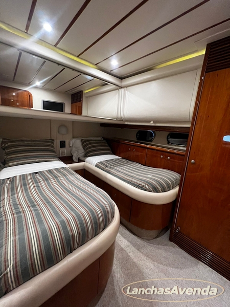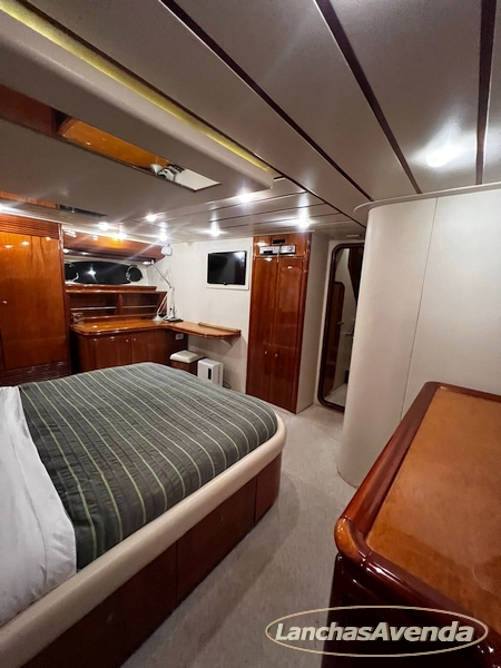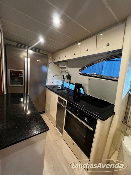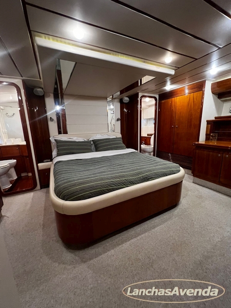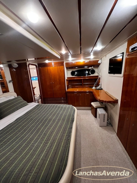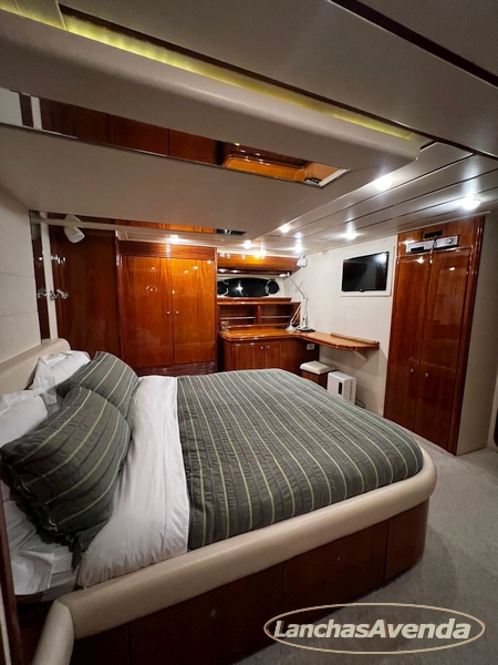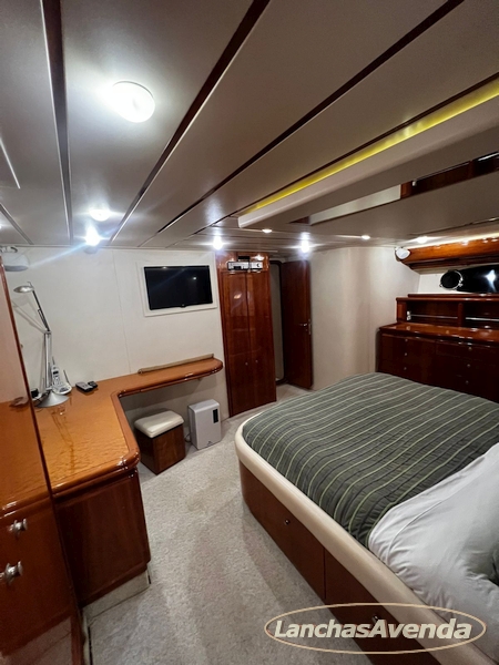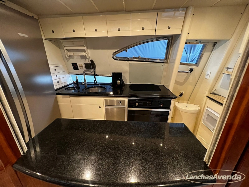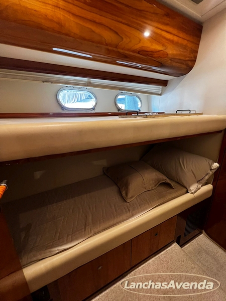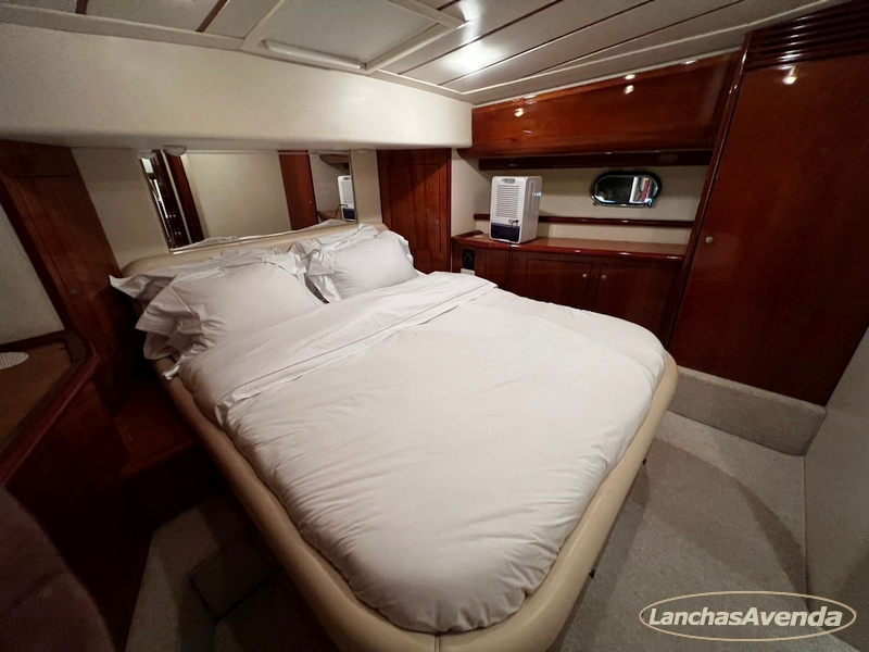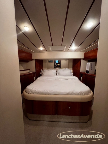 Suite master de casal + suite para segundo casal + 2 suites de solteiros + cozinha completa + banheiro + amplo salão + ampla popa + amplo fly bridge + cabine de marinheiros.