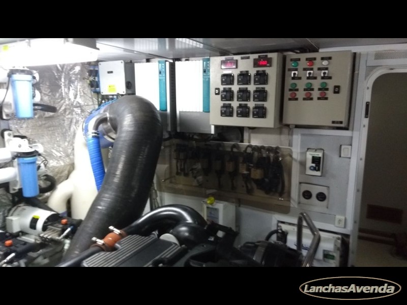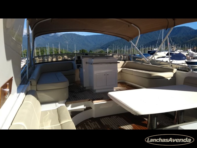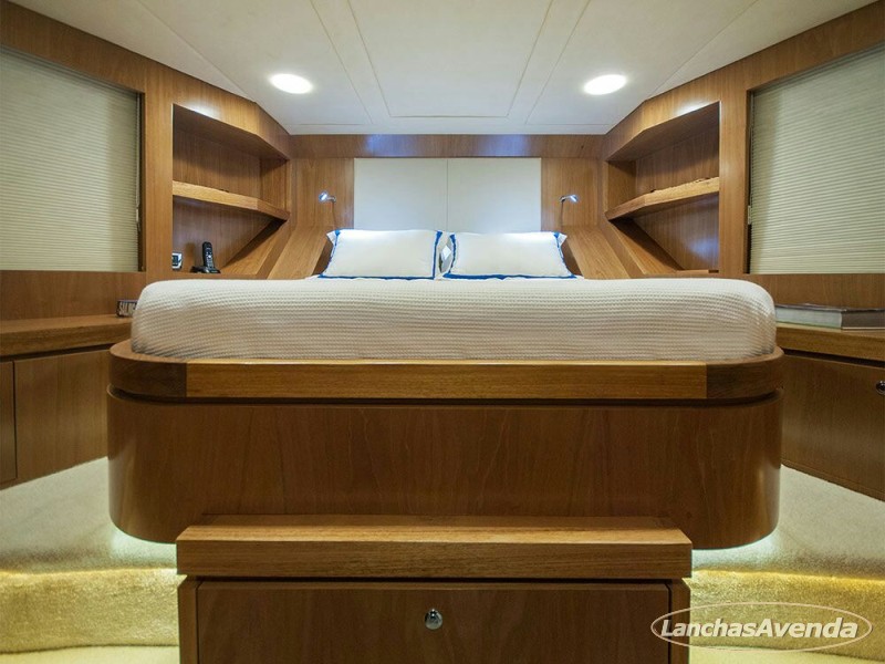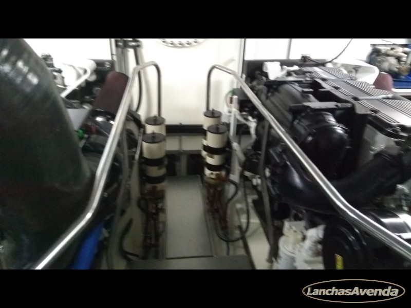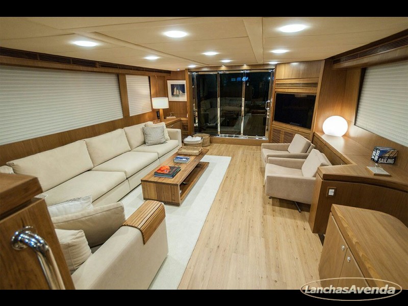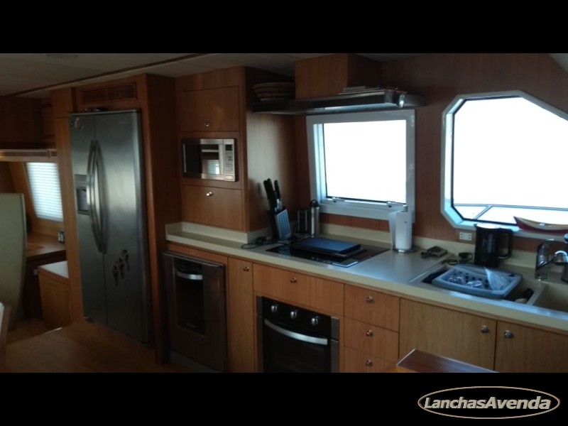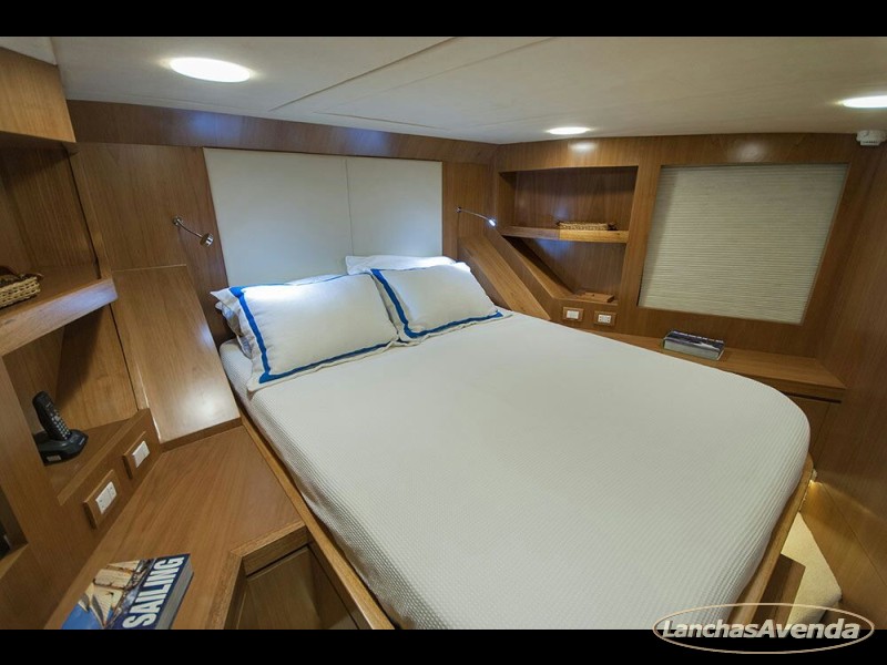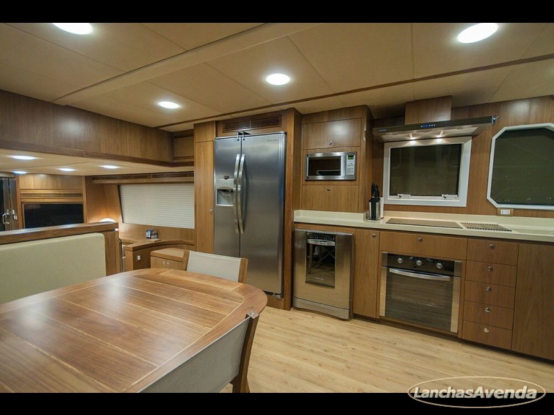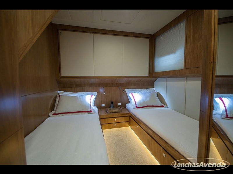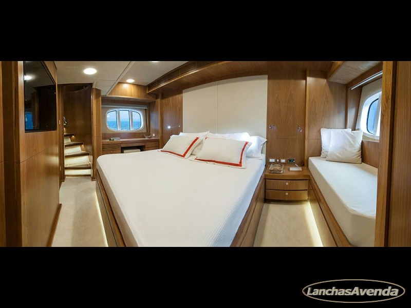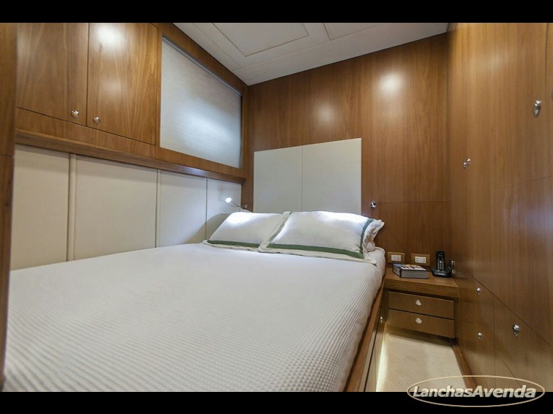 Suite master de casal + suite para segundo casal + 2 suites de solteiros + cozinha completa + banheiro + amplo salão + ampla popa + amplo fly bridge + cabine de marinheiros.