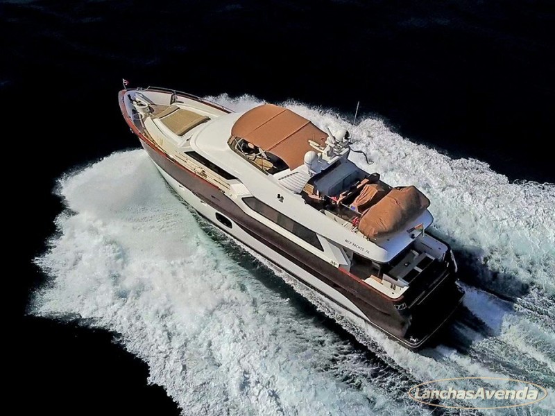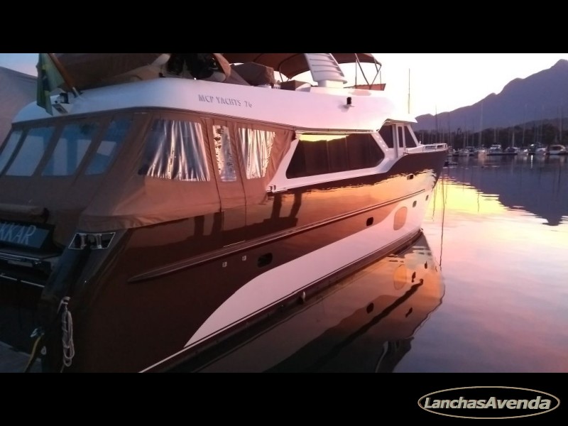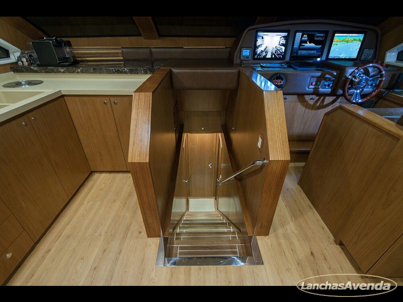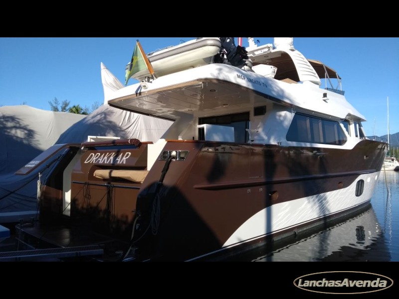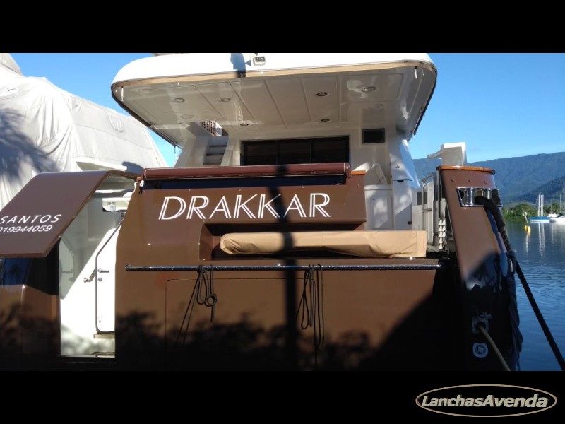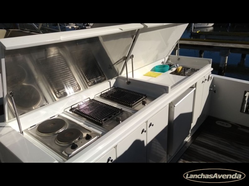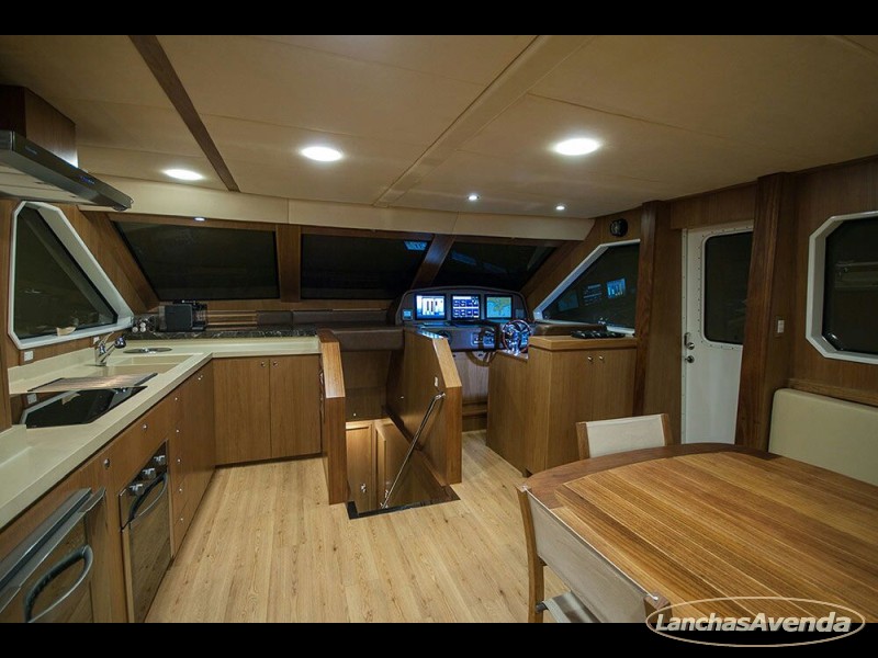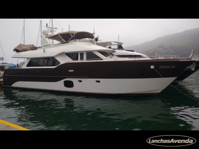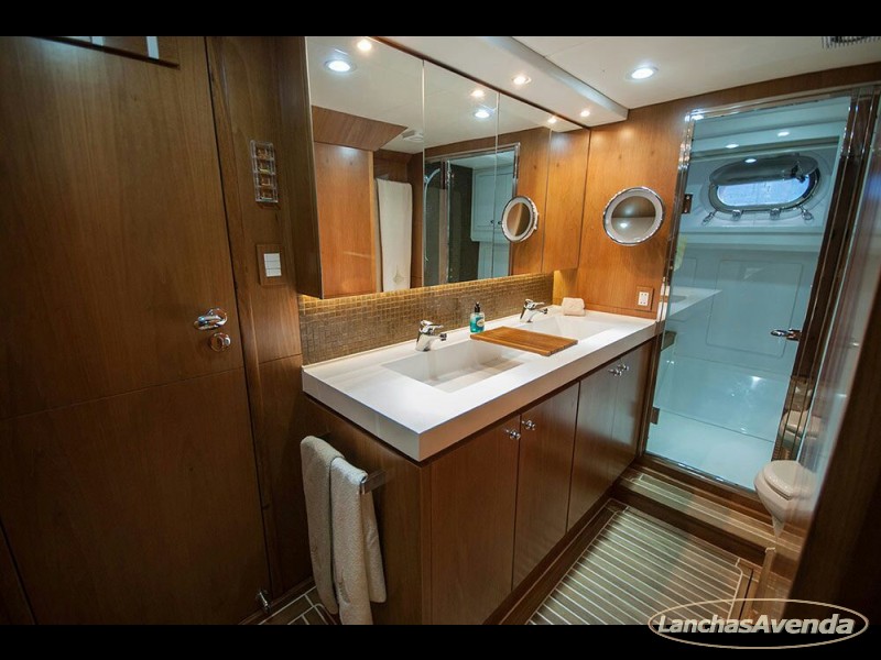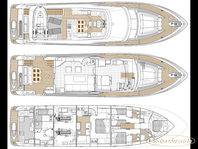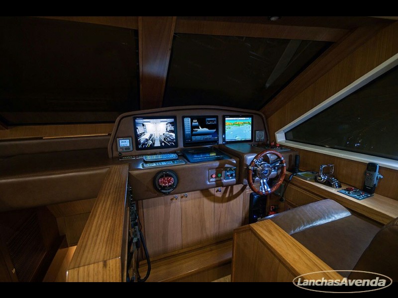 Suite master de casal + suite para segundo casal + 2 suites de solteiros + cozinha completa + banheiro + amplo salão + ampla popa + amplo fly bridge + cabine de marinheiros.
