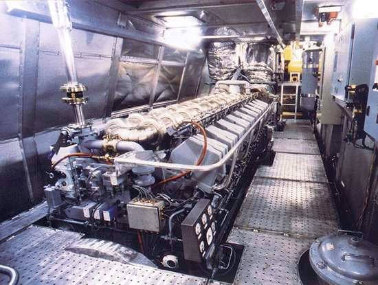 O Express Condor é alimentado por quatro motores 20 cilindros Ruston RK270 diesel, de 7.080 kW. Cada um motor toca uma turbina Lips waterjet LJ145D montadas na popa e caixas de redução Renk ASL60. A direção, inversão e vectorização do impulso dos bicos de jato de água são realizados por um Lipstronic Jet Control System, que também fornece o sistema de piloto automático. Consumo de combustível é 212g/kWh ou 0.21l por passageiro em condições de cruzeiro de 44 nós. Dois geradores de 230kW Caterpillar estão localizados em cada casco, para fornecer a energia elétrica. Isso alimenta independentemente os quadros principais para fornecer a alimentação CA 415/240V trifásico e distribuição geral. |